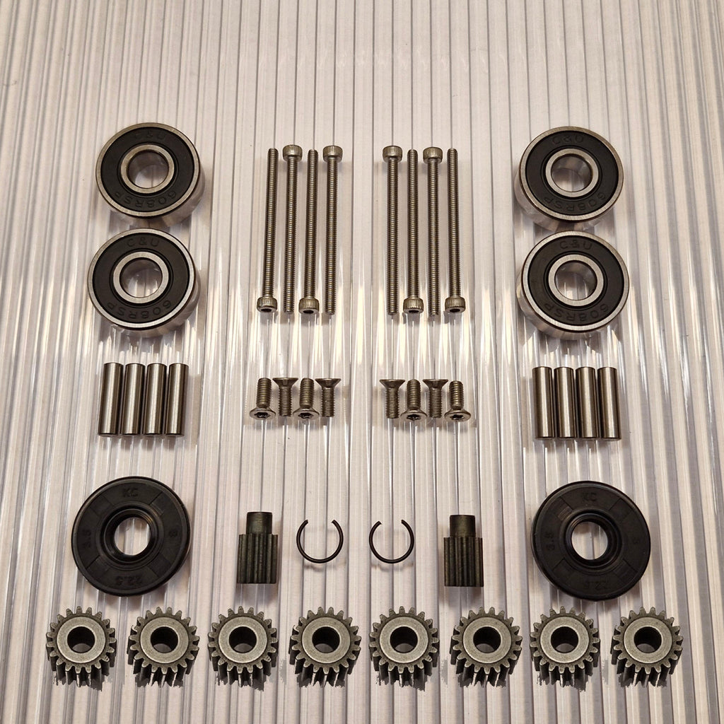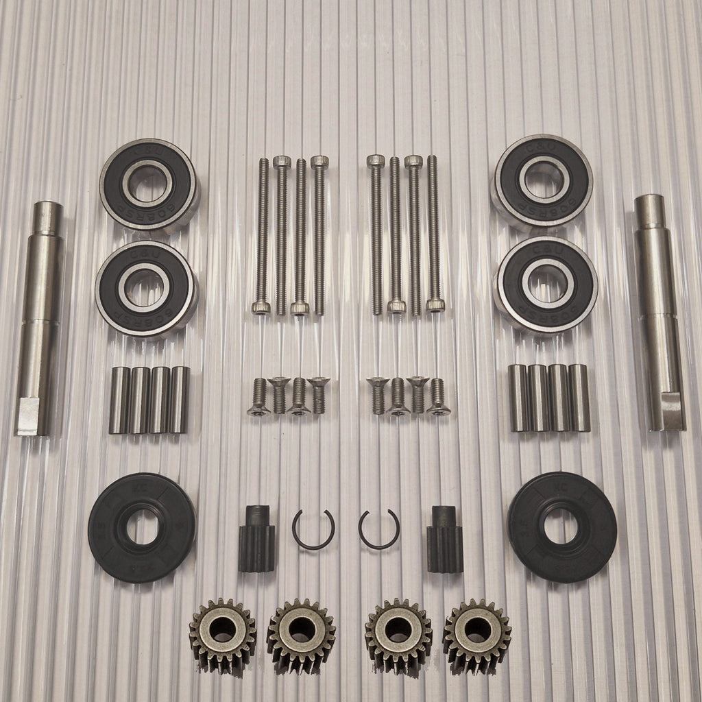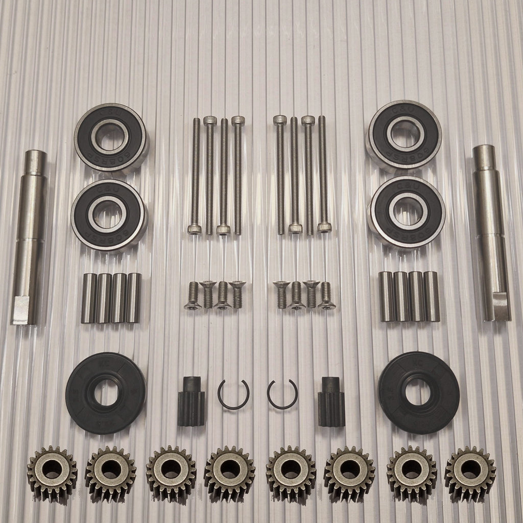 Zahnräder aus gehärtetem Qualitätsstahl. Neue Stifte für die dem Rad am nächsten gelegenen Planetenräder sind im Kit enthalten. Edelstahlschrauben mit rutschfestem Torx- und Inbus-Griff.