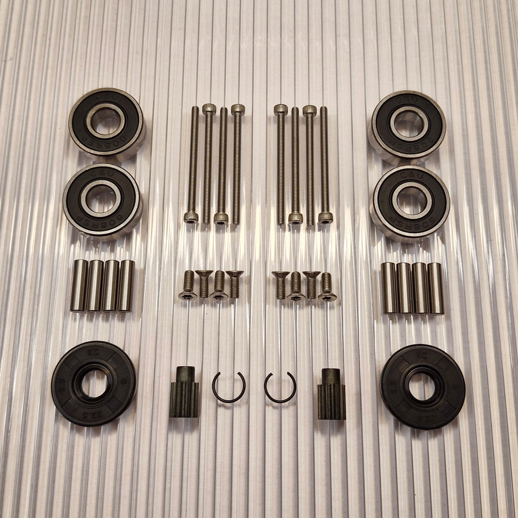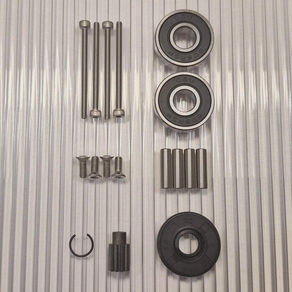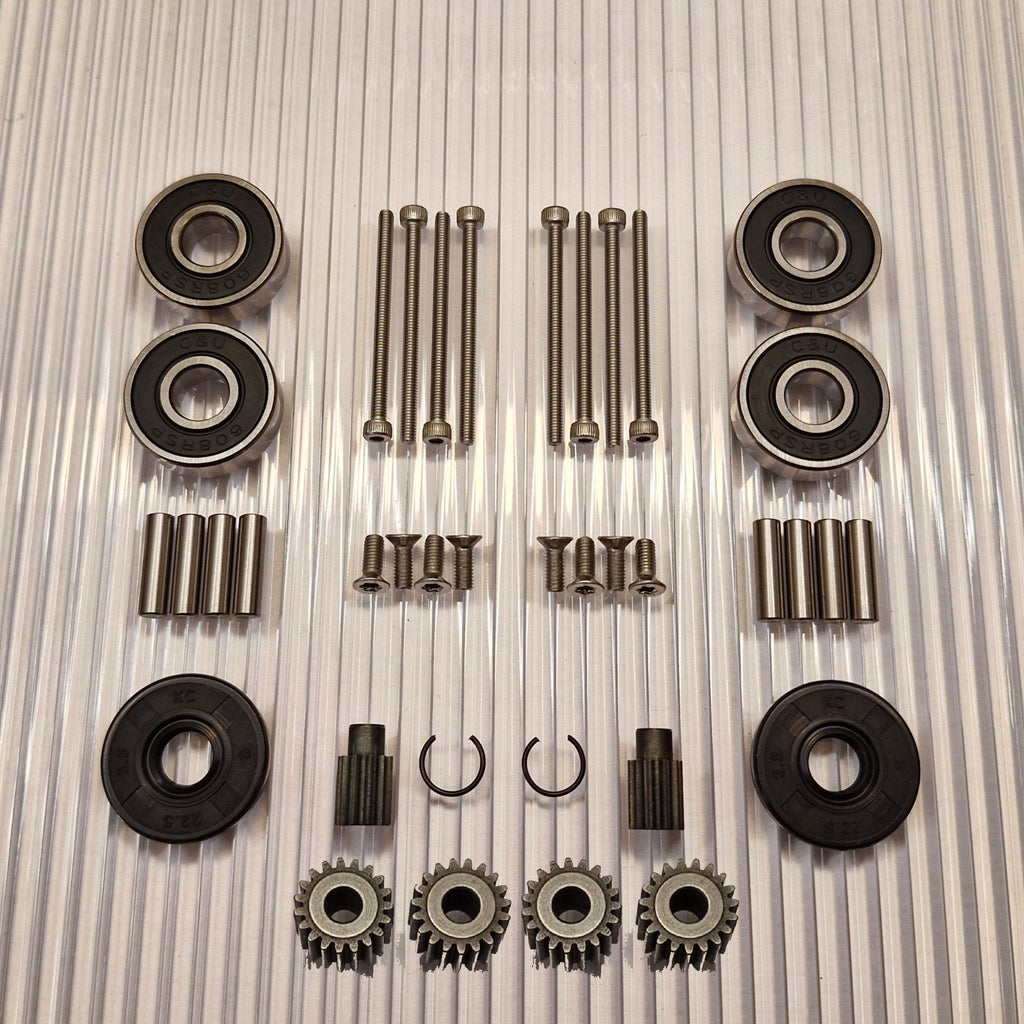 Zahnräder aus gehärtetem Qualitätsstahl. Neue Stifte für die dem Rad am nächsten gelegenen Planetenräder sind im Kit enthalten. Edelstahlschrauben mit rutschfestem Torx- und Inbus-Griff.